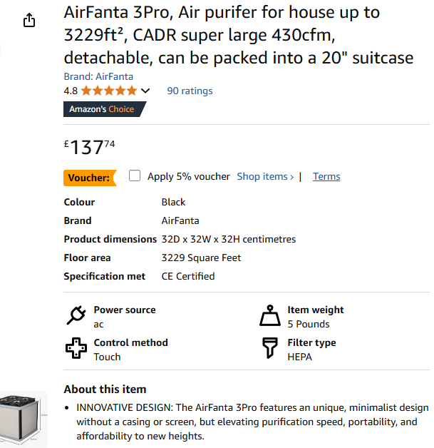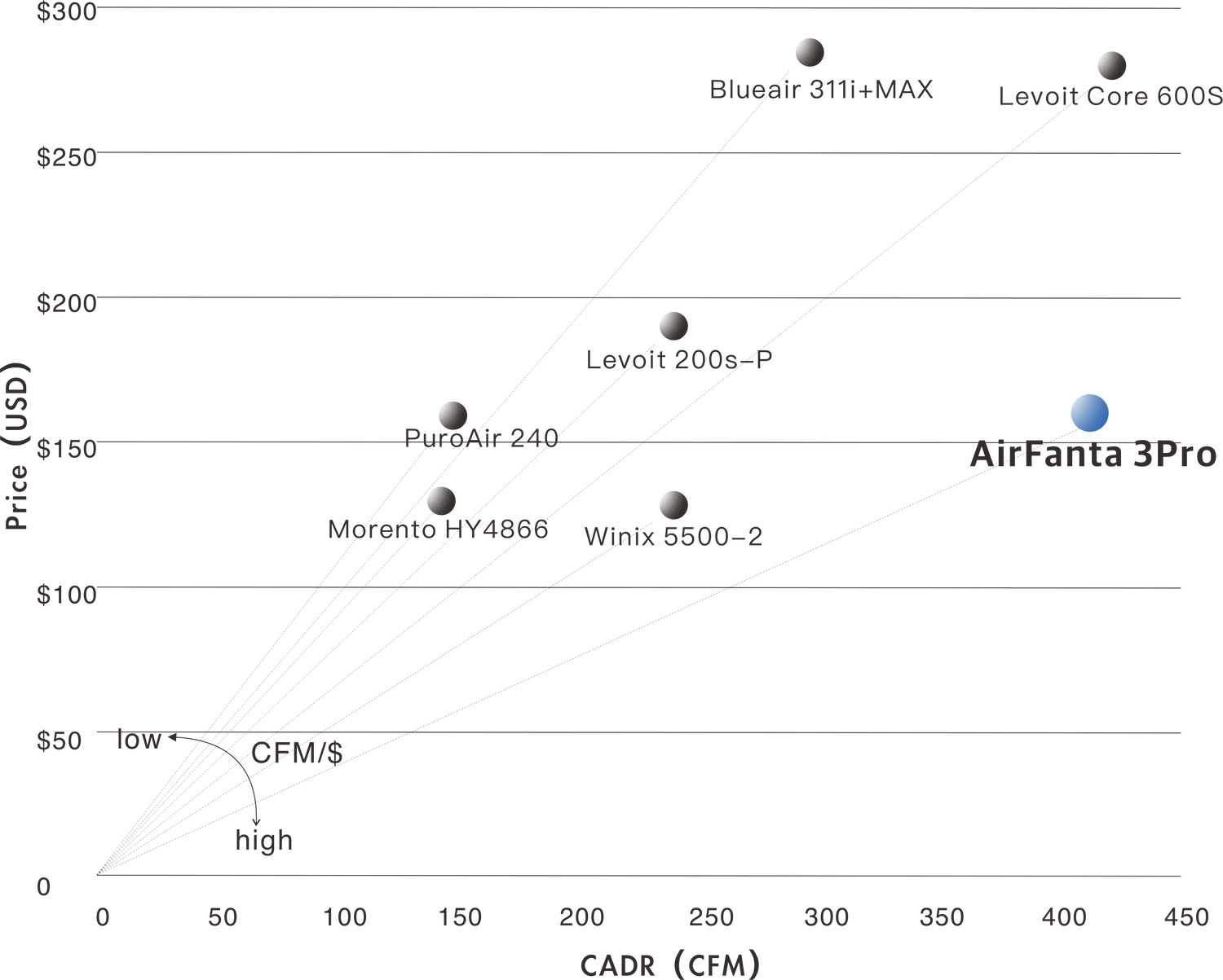 Our product, the 3Pro, boasts an impressive CADR rating and is priced competitively, resulting in a superior CFM/$ ratio compared to many other well-known air purifiers.