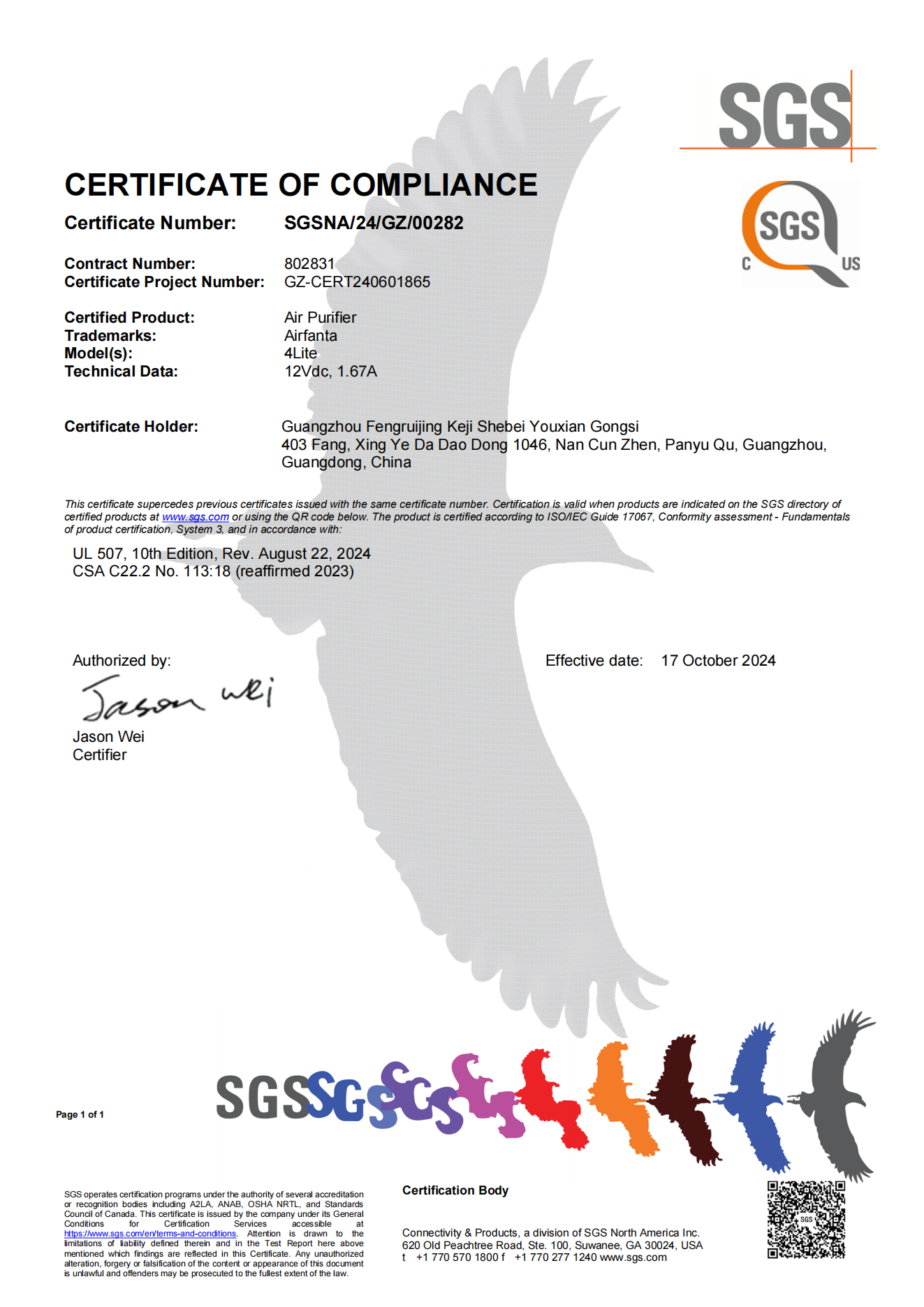 Our products are UL 507 certified by SGS to guarantee safety and are also approved by the California Air Resources Board (CARB) to ensure they do not emit ozone.